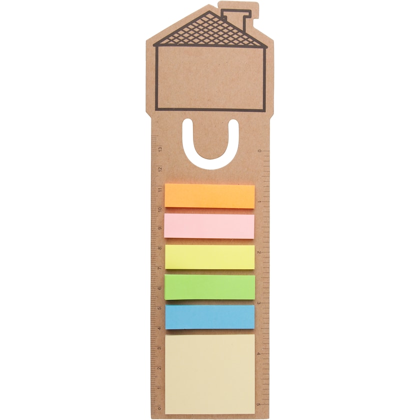 Teippimerkkejä paperiviivottimessa, jossa talon kuva. Tämän hauskan tuotteen mukana tulee sekä teippimerkkejä että muistiinpanolehtiö. Sopii hyvin esimerkiksi asuntoalalla työskenteleville!