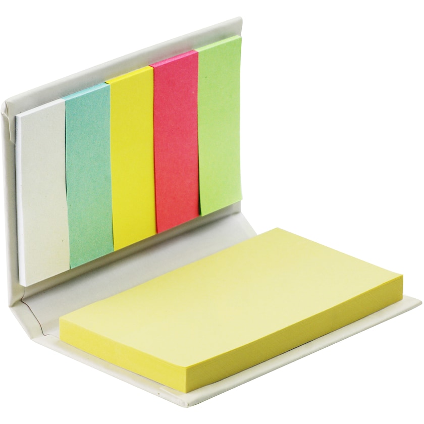 Mukava paketti, jossa muistio ja erivärisiä teippimerkkejä.