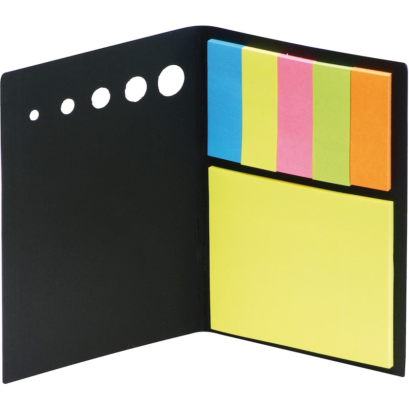 Paketti, jossa muistio ja teippimerkkejä viidessä eri värissä. Painatus tehdään kannen etupuolelle.