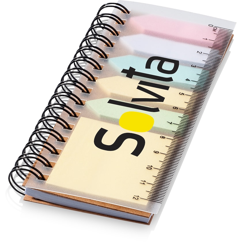 Teippimerkkisetti kierrelehtiössä. Spiralessa on 25 teippimerkkiä viidessä eri värissä, 25 teippimuistilappua ja lehtiö, jossa 40 viivoitettua valkoista sivua. Muovikansi toimii myös viivaimena.