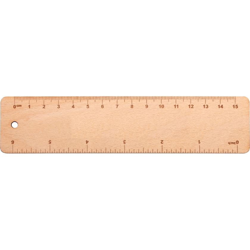 15 cm puuviivoitin, joka on valmistettu Euroopassa. Merkintä tehdään joko painatuksella tai laserkaiverruksella.