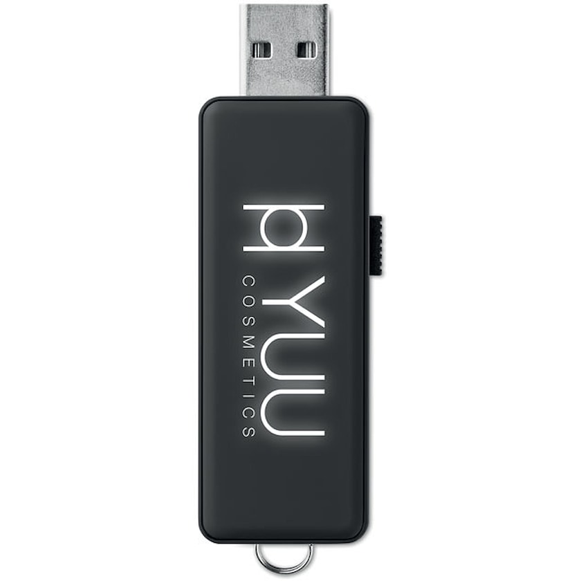 USB-tikku, jossa logosi loistaa valoa. Logosi laserkaiverretaan USB-tikulle ja käytön aikana siihen syttyy valo. Voit valita punaisen, sinisen, vihreän, keltaisen tai valkoisen valon välillä. Valaise brändiäsi!