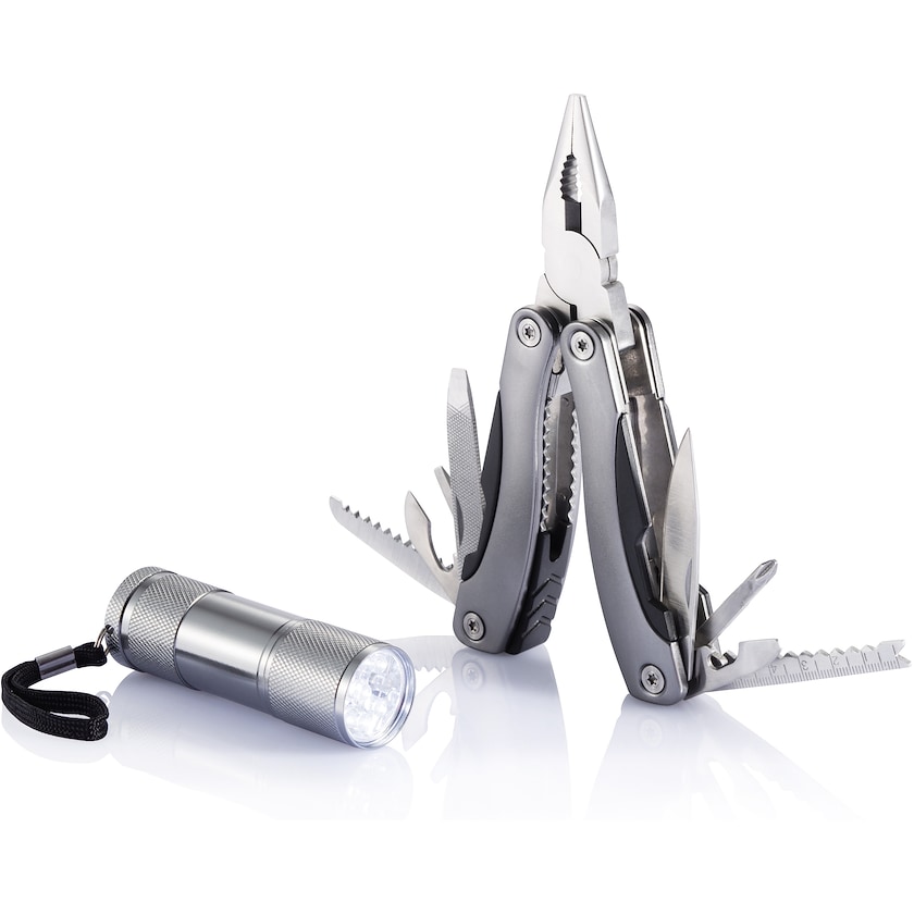 Käytännöllinen setti, jossa monitoimityökalu Baumgarten sekä LED-taskulamppu. Monitoimityökalussa on 14 toimintoa ja taskulampussa on yhdeksän valkoista LED-lamppua. Koko setti toimitetaan mustassa lahjapakkauksessa. Paino- ja kaiverrushinta koskee merkkausta yhteen tuotteeseen.