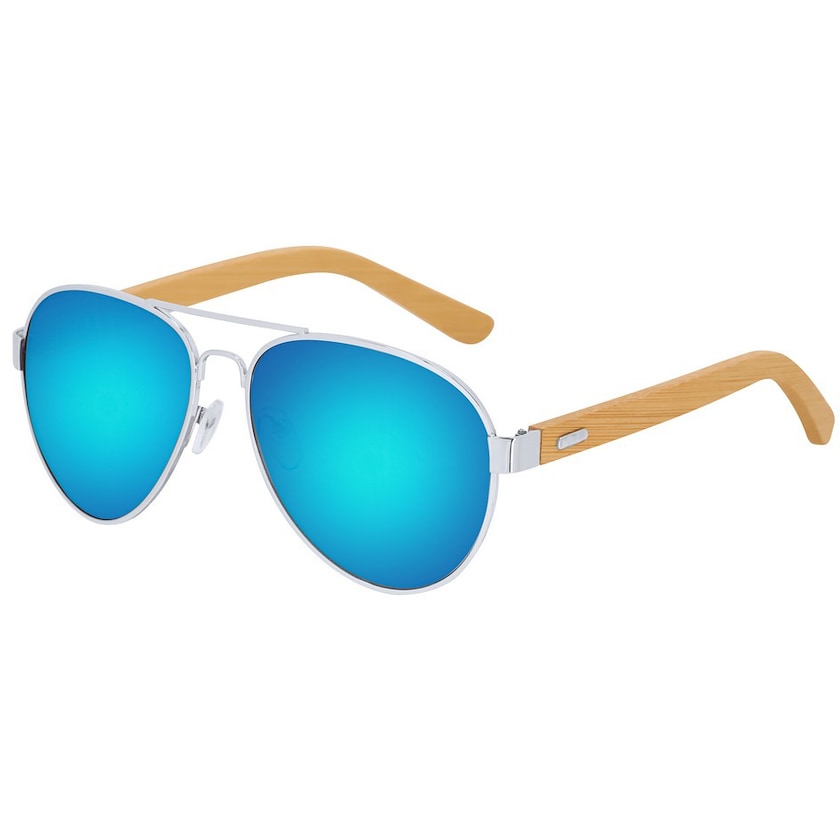Pilottilasit peilaavilla linsseillä. Linsseissä on UV400-suoja. Raamit ovat valmistettu bambusta. Toimitetaan mikrokuitupussissa.