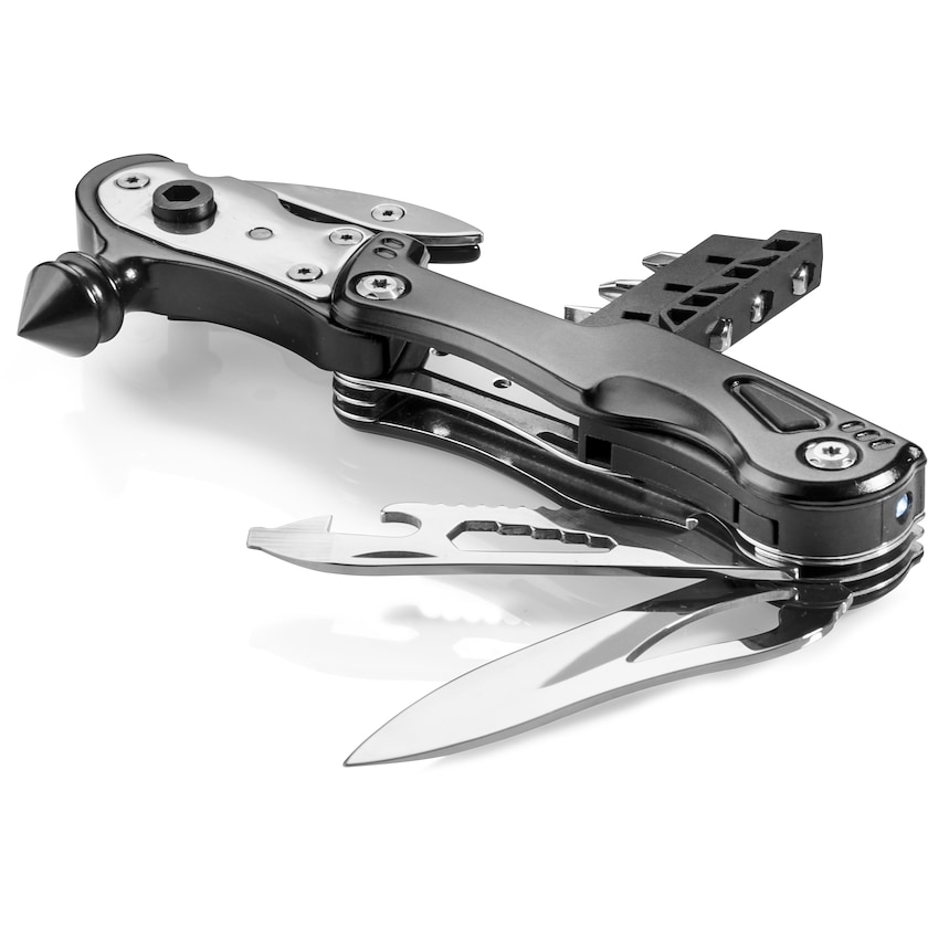11 toiminnon hätävasara. Tässä tuotteessa yhdistyvät mm. turvavyöleikkuri, ikkunavasara, taskulamppu, veitsi, pullonavaaja ja sakset. Mukana musta säilytyspussi. Painatus vain laserkaiverruksena.