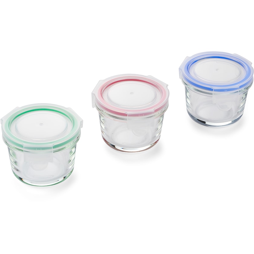Kolmen pienen purkin setti. Tuotteiden materiaalina on kestävä borosilikaattilasi. Painatushinta koskee yhden purkin painatusta. Tuotteet ovat tiskikoneen, mikron, uunin sekä pakastimen kestäviä.