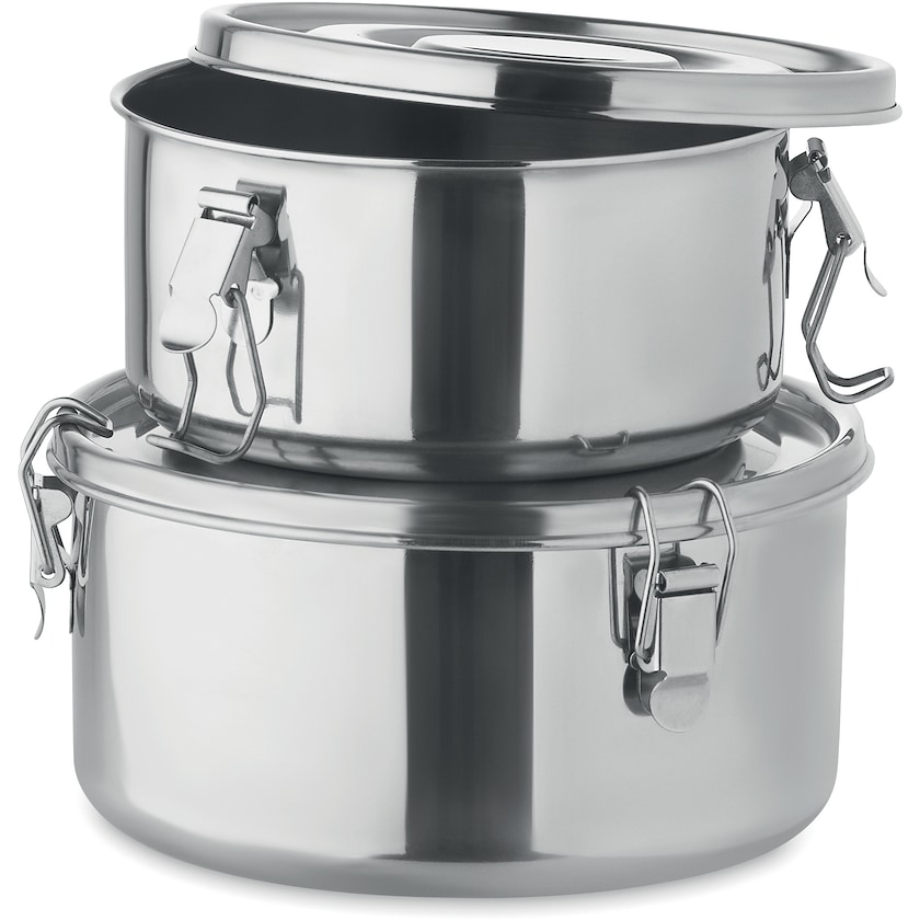Kahden teräksisen eväsrasian setti. Rasioissa on jämäkät soljet, jotka pitävät kannet paikoillaan. Astioiden tilavuus on 45 cl ja 90 cl ja ne voi pestä tiskikoneessa. Laserkaiverruksen hinta koskee yhden tuotteen kustomointia kaiverruksella.