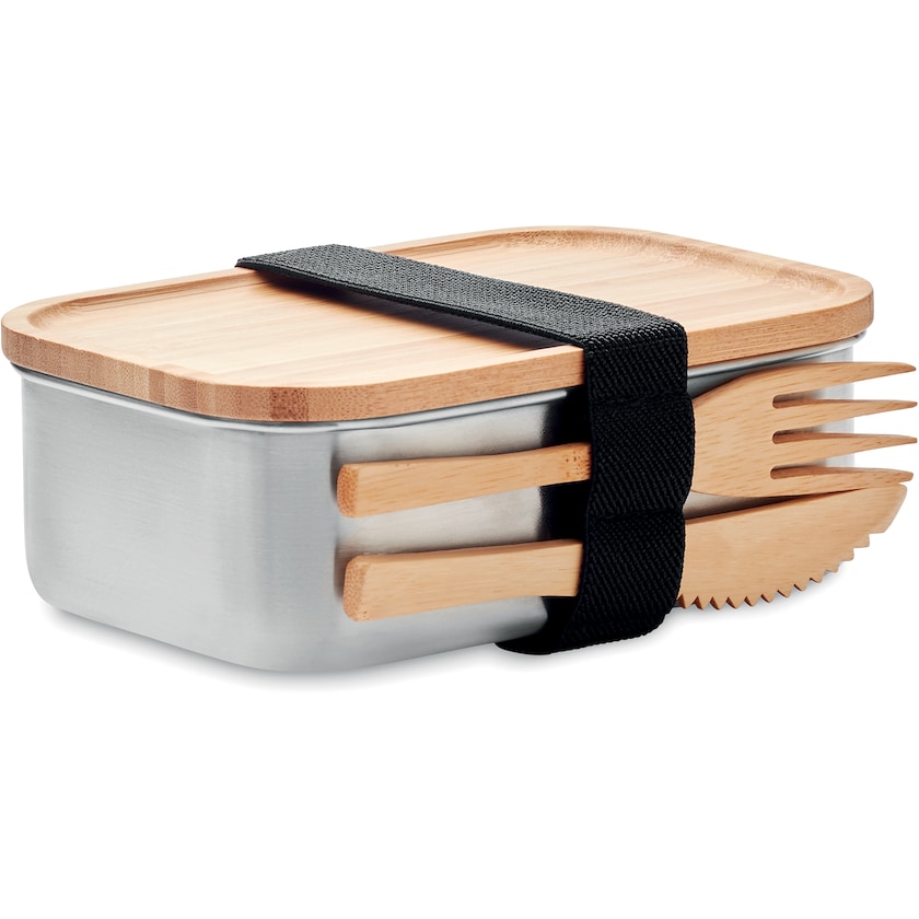 Teräksinen eväsrasia bambukannella. Mukana bambuaterimet. Rasian kansi pysyy paikoillaan polyesteriremmin avulla.