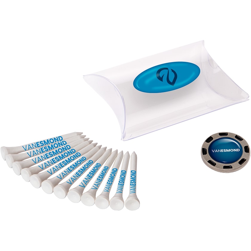 Setti, johon kuuluu 12 kpl 70 mm tiitä ja 1 merkkausnasta. Painatushintaan kuuluu digipainatus niin pakkaukseen, merkkausnastaan kuin jokaiseen tiihin. Pakkauksessa ja nastassa painatuksen päälle tulee suojaava epoksipinta, joka tekee lopputuloksesta ylellisen. Täydellinen lahja golfaajalle!
