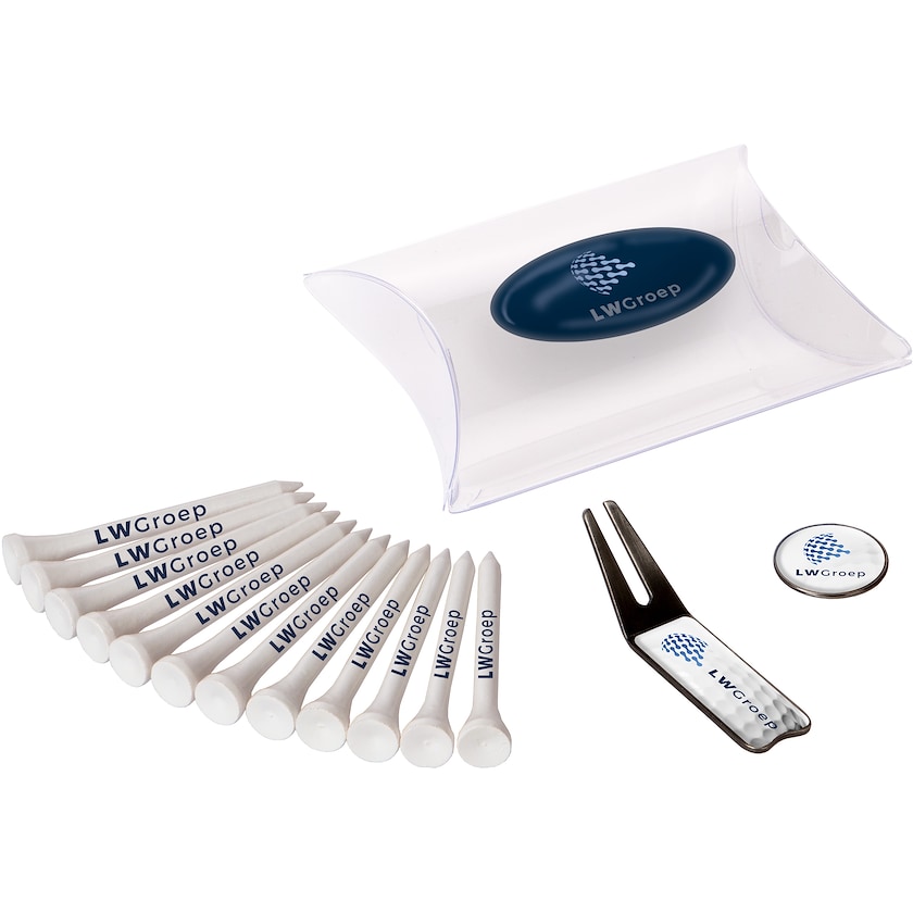 Golfsetti, joka sisältää tiitä, greenihaarukan ja merkkausnastan. Painatus tehdään digipainatuksena pakkaukseen, merkkausnastaan, greenihaarukkaan sekä kaikkiin 12 tiihin. Tiit ovat 70 mm pitkiä ja niiden materiaali on bambua.