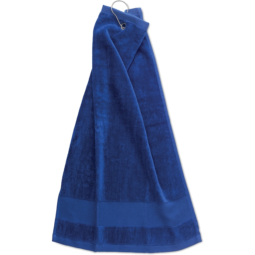 Puuvillainen golfpyyhe. Pyyhkeen yläosassa on metallilenkki, jonka avulla sen voi kiinnittää golfbägiin. Kankaan paino on 350 gram/m².