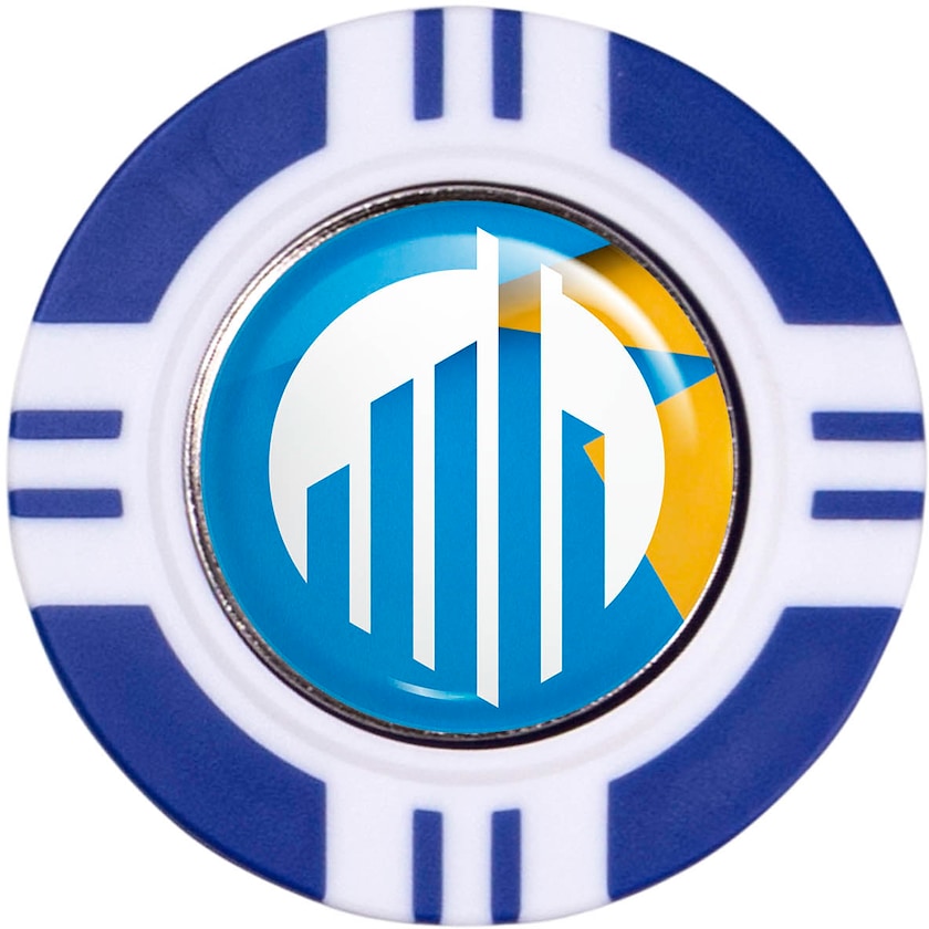 Pokerimerkin näköinen metallinen merkkausnasta. Painatus tehdään merkin keskelle digipainatuksena, ja sen päälle tulee suojaava epoksipinnoite.