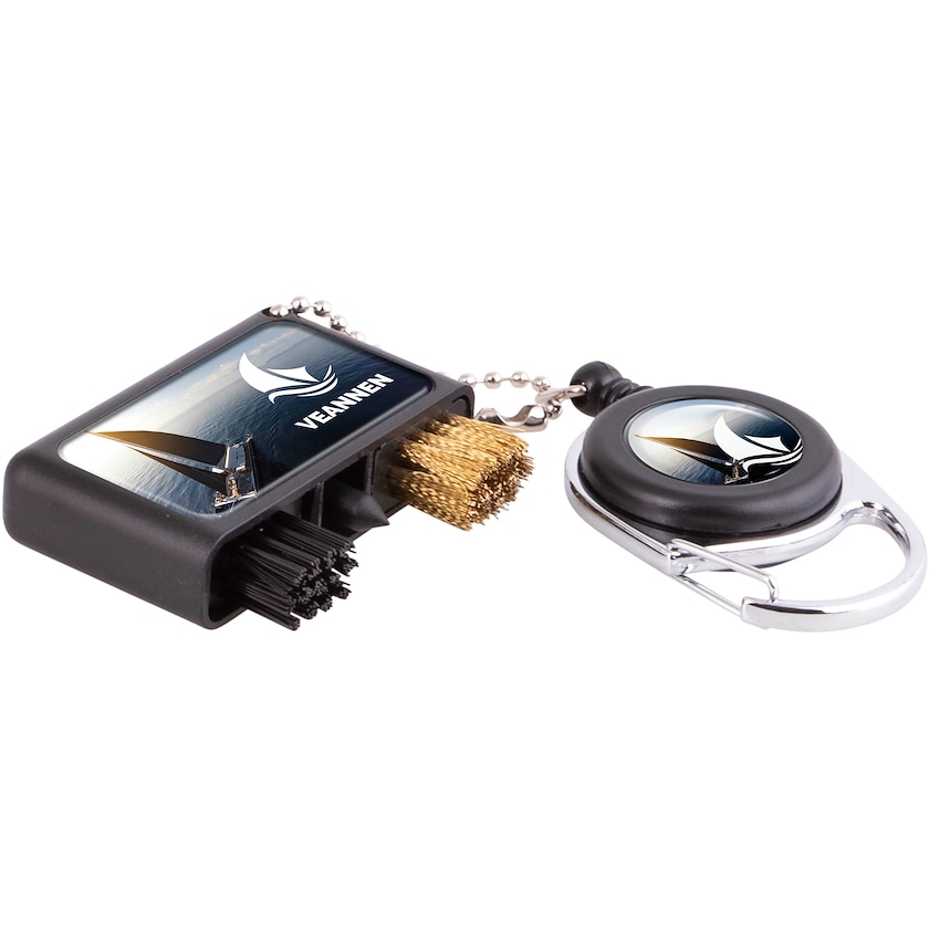 Mailaharja, jonka kiinnike on varustettu kelautuvalla kuminauhalla. Golfmailan puhdistusharjassa on sekä messinkiharja että nylonharja. Lisäksi siinä on kätevä puhdistuspiikki. Painatus tehdään digipainatuksella sekä harjaan että hissikorttipidikkeeseen. Painatus on suojattu epoksikerroksella, joka antaa ylellisen viimeistelyn.