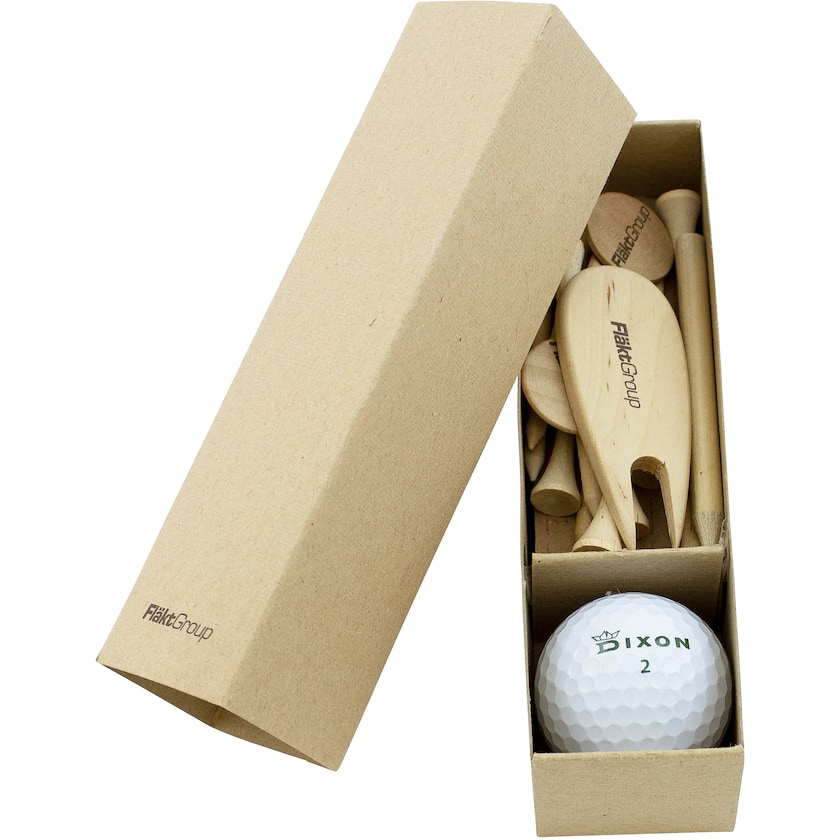 Setti, joka sisältää golftarvikkeita. Pakkaus sisältää ympäristöystävällisen Dixon Earth-golfpallon, 10 puista tiitä, 2 puista merkkausnastaa, lyijykynän sekä puisen greenihaarukan. Painatus tehdään kaikkiin tarvikkeisiin sekä pahvipakkaukseen. Merkkaus vain 1-väripainatuksena.