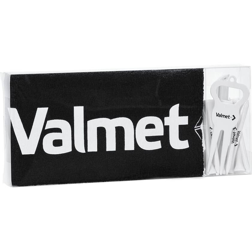 Golfpyyhe ja golfvarusteet lahjapakkauksessa. Setti sisältää pyyhkeen lisäksi 10 tiitä, 2 merkkausnastaa, greenihaarkan sekä kynän. Kaikkiin tuotteisiin saa oman logon.
