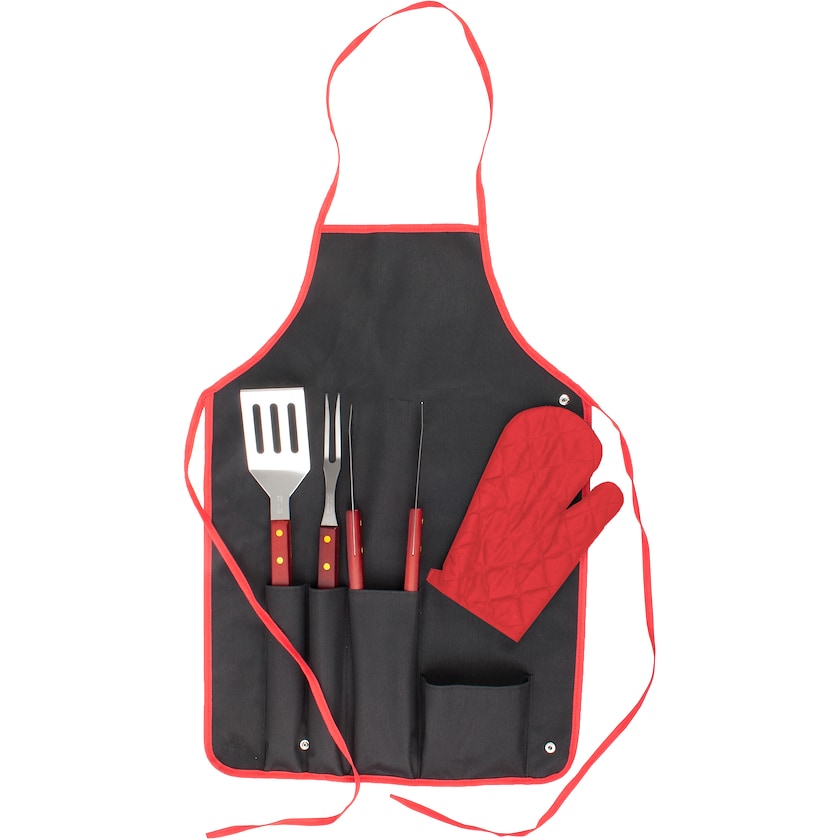 Hauska grillisetti, jonka esiliina toimii myös säilytyspussina. Setti sisältää paistinlastan, grillipihdit, grillihaarukan puukahvalla sekä patalapun ja esiliinan.