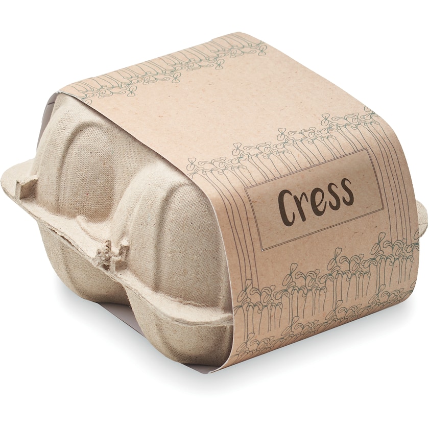 Viljelysarja krassille kivassa munalaatikossa. Setti koostuu neljästä saviruukusta, jotka on täytetty mullalla ja siemenillä. Painatus tehdään paperikääreelle, joka ympäröi munapakkausta. Valmistettu EU:ssa.