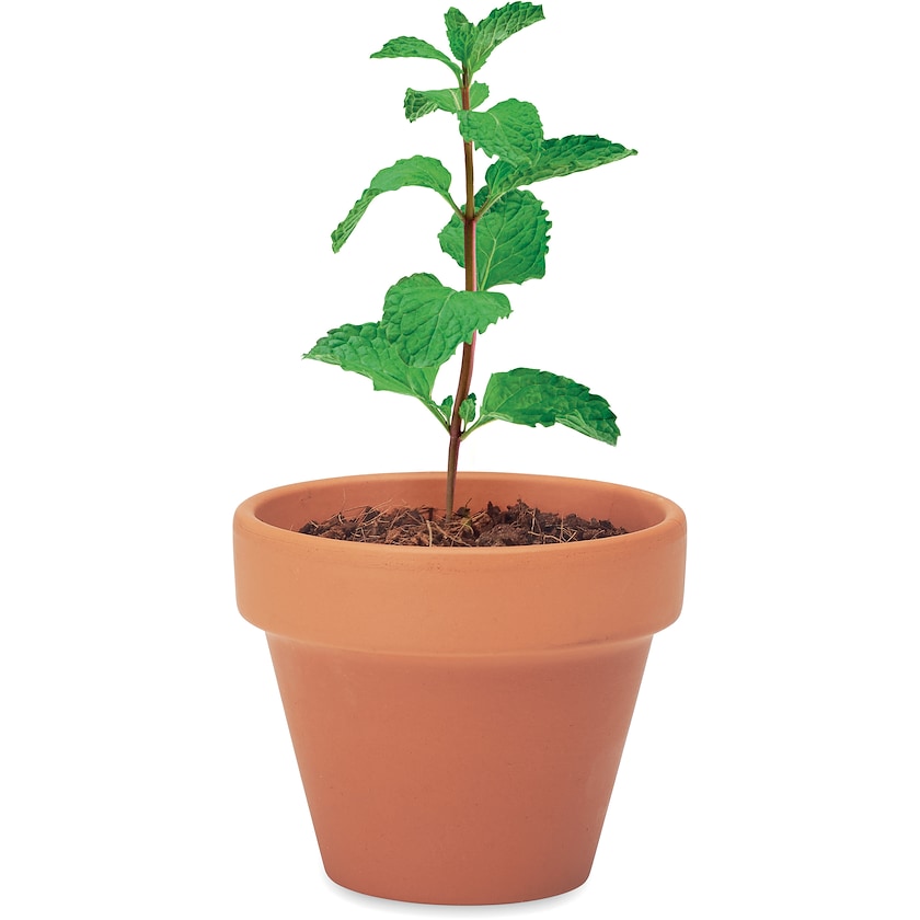 Terrakottaruukku multatabletilla ja mintunsiemenillä. Merkintä tehdään joko 1-väripainatuksella tai laserkaiverruksella. Valmistettu EU:ssa.