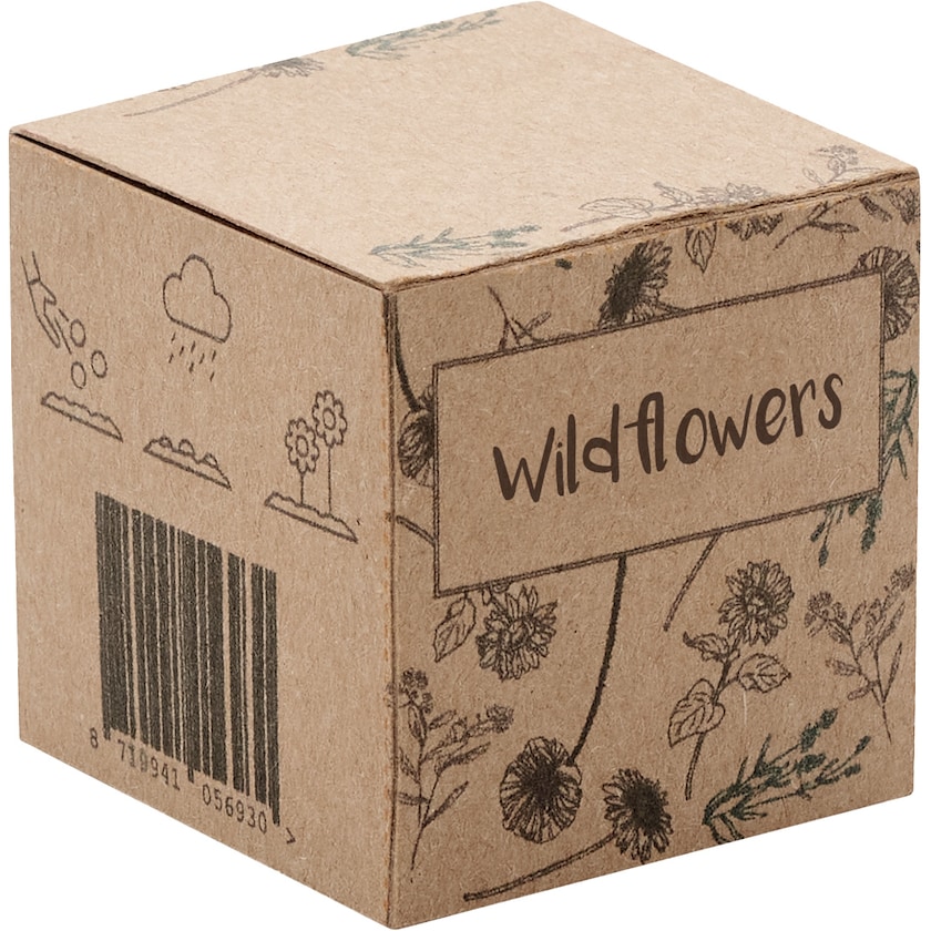 Siemenillä täytetty kasvipallo luonnonkukkia varten. Toimitetaan luonnollisen värisessä pahvilaatikossa, johon painatus tehdään. Valmistettu EU:ssa.