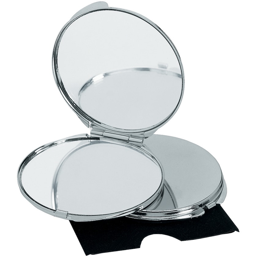 Kromattu meikkipeili metallista. Taskupeilin toinen puoli on suurentava ja toinen 1:1. Tuotteet toimitetaan tyylikkäisiin mustiin samettitaskuihin pakattuina. Peili on kustomoitavissa laserkaiverruksella.
