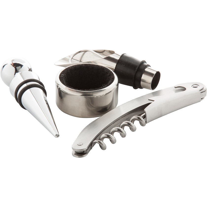 Neliosainen setti, johon kuuluu pullonavaaja-korkkiruuvi, tipparengas, kaadin ja korkki Laserkaiverrus tehdään korkkiruuviin.