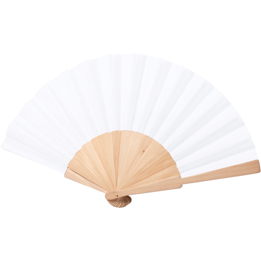 Ekoviuhka, johon saa oman painatuksen. Viuhkan kangas on rPET-materiaalia, joka tuotetaan kierrätetyistä PET-muovipulloista. Merkkaus tehdään bamburimaan.