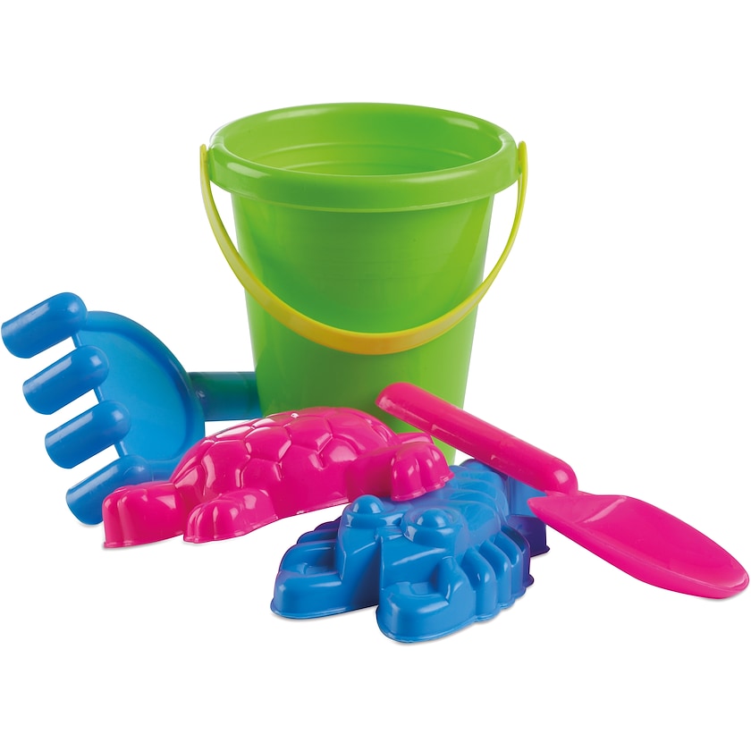 Värikäs rantalelusetti. Sisältää ämpärin, lapion, haravan ja kaksi muottia. Lasten kesäsuosikki!