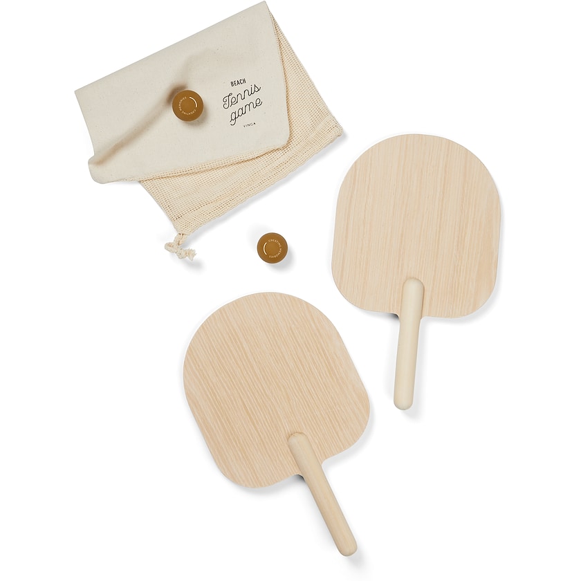 Puinen rantatennissetti merkiltä Vinga. Hauskaa viihdettä rannalle, puistoon tai omalle takapihalle. Setti sisältää kaksi mailaa, kaksi kumipalloa sekä puuvillaisen säilytyspussin. Mailat ovat kooltaan 350 x 210 mm ja ne on tehty FSC-sertifioidusta vanerista.