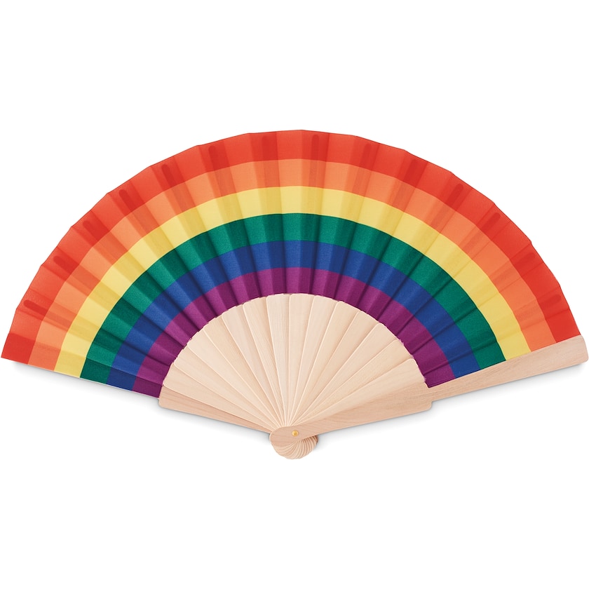 Sateenkaarikuvioitu viuhka. Ramen on valmistettu puusta ja sen kangas on polyesteriä. Merkkaus painatuksena tai laserkaiverruksena viuhkan puuosaan.