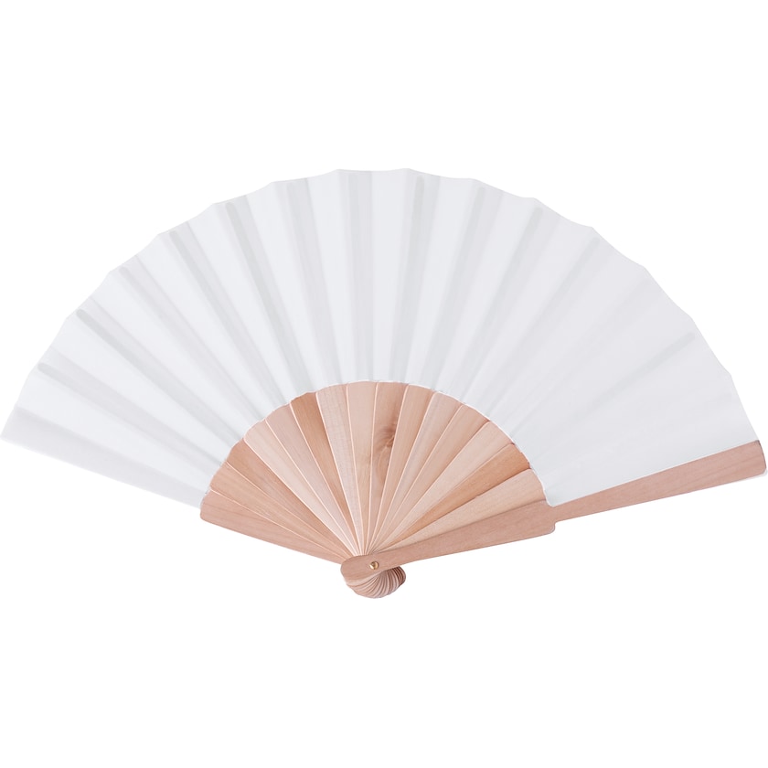 Puinen viuhka kestävällä polyesteri- ja puuvillakankaalla. Merkintä tehdään painatuksella tai laserkaiverruksella puurimaan.