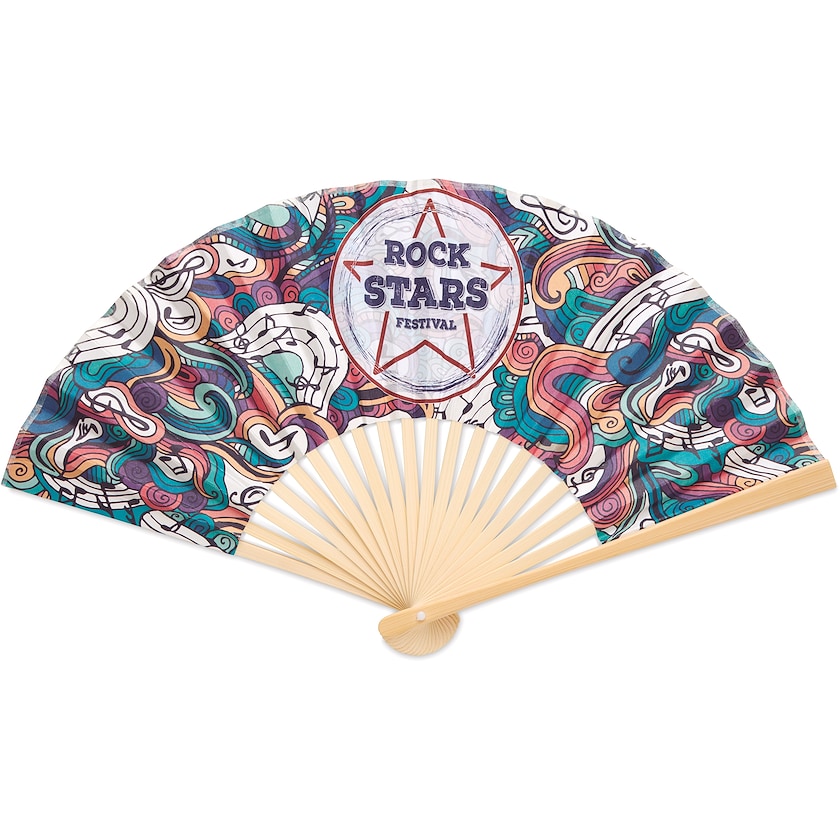 Viuhka yksipuolisella painatuksella koko pinnalle. Zaragoza on valmistettu bambusta ja 80 grammasta paperia. Koko pinta-ala painatetaan toiveidesi mukaan. Lataa painomalli ja luo ainutlaatuinen viuhkasi jo tänään!