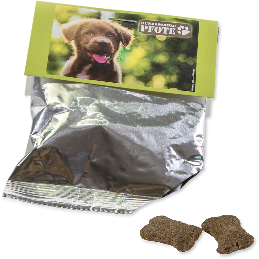 Koirien herkkuja pakkauksessa, jossa on kustomoitava mainoskortti. Koko kortti painetaan toiveidesi mukaisesti. Snacksit ovat Happy Dogin valmistamia ja sopivat yli 4 kuukauden ikäisille koirille.