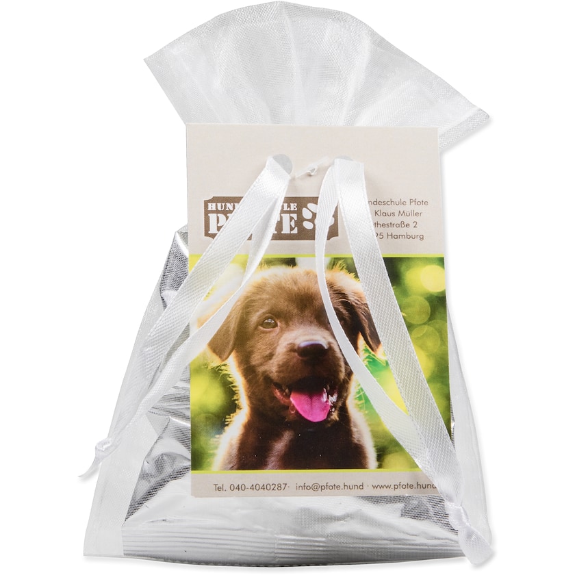 Koirien snackseja organzapussissa. Pussin kiritysnaruissa on kortti, johon saa oman valokuvapainatuksen. Snacksit ovat Happy Dogin valmistamia ja sopivat yli 4 kuukauden ikäisille koirille.