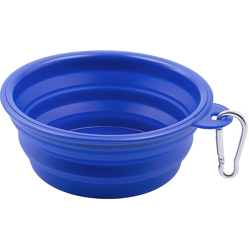 Taittuva koiran juomakuppi karabiinihakalla. Koska koiran kulho on taitettava, se ei vie paljon tilaa silloin kun se ei ole käytössä.