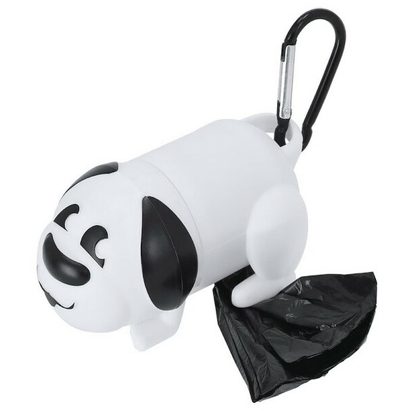 15 koirankakkapussia koiranmuotoisessa rasiassa. Rasia on varustettu karabiinihaalla.