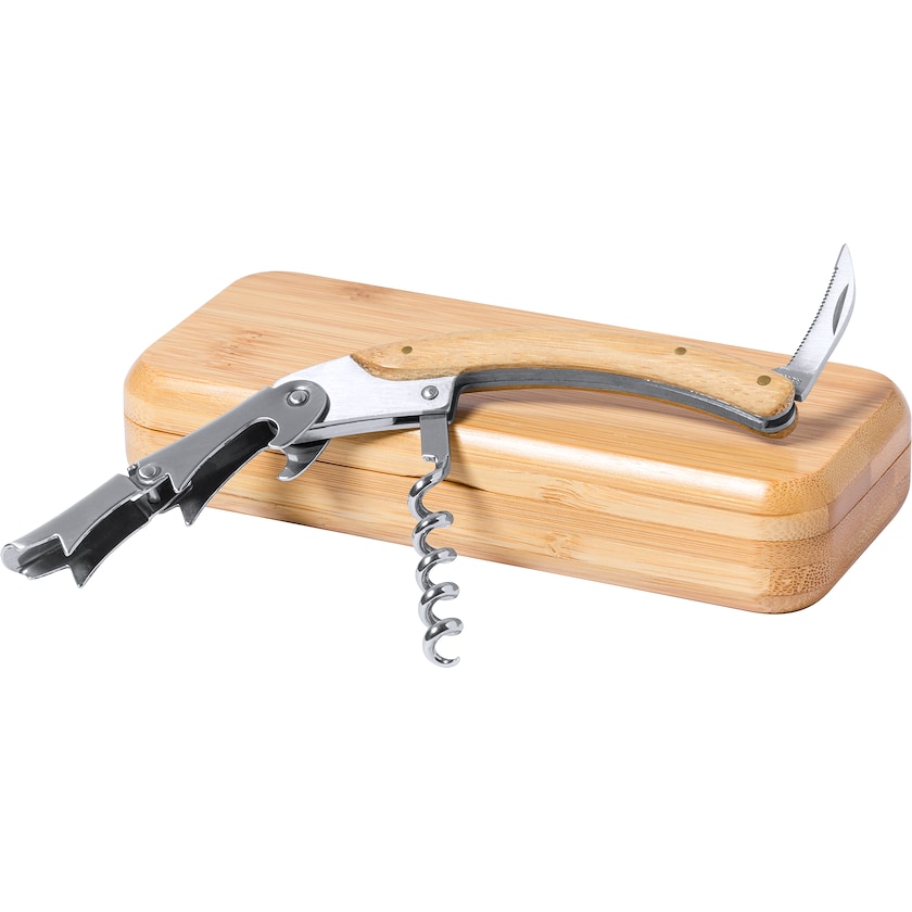 Viinipullonavaaja ruostumattomasta teräksestä ja bambusta. Tuote toimitetaan hienossa bambusta valmistetussa säilytysrasiassa. Täydellinen lahja viiniharrastajille.