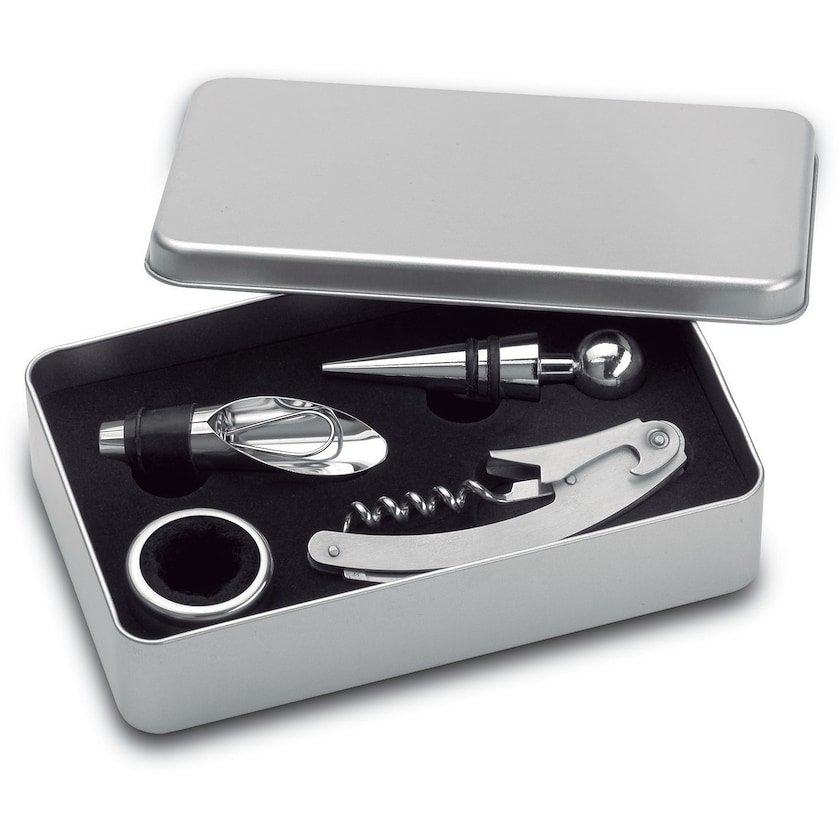 Neliosainen korkkiruuvisetti hienossa metallisessa lahjalaatikossa. Merkkaus joko painatuksena tai laserkaiverruksena.