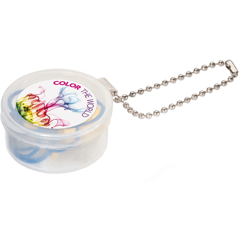 Korvatulpat muovipurkissa, johon saa digipainatetun etiketin. Säilytyspurkissa on pieni metalliketju. Korvatuplat on yhdistetty toisiinsa narulla, ja ne voi ripustaa kaulaan silloin kun niitä ei käytä.