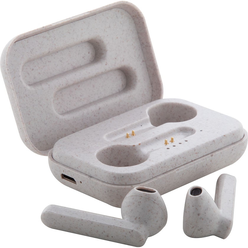 Ympäristöystävälliset langattomat kuulokkeet painatuksella. Higginsport on valmistettu luomuvehnän oljesta. USB-latauskaapeli tulee mukana. Toimitetaan luonnonvärisessä pahvilaatikossa.