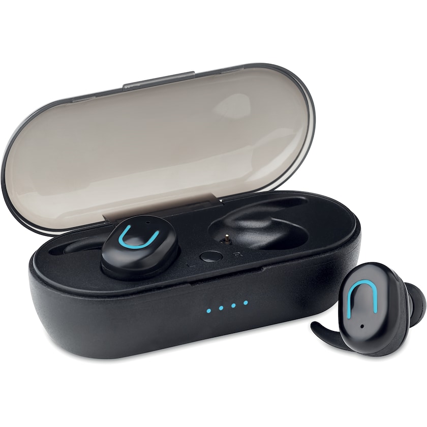 Langattomat kuulokkeet stereoäänentoistolla. Kuulokkeille saa n. 3 tuntia soittoaikaa yhdellä latauksella. Mukana mikro-USB-kaapeli. Kuulokkeet toimitetaan rasiassa, joka toimii myös niiden latausasemana.