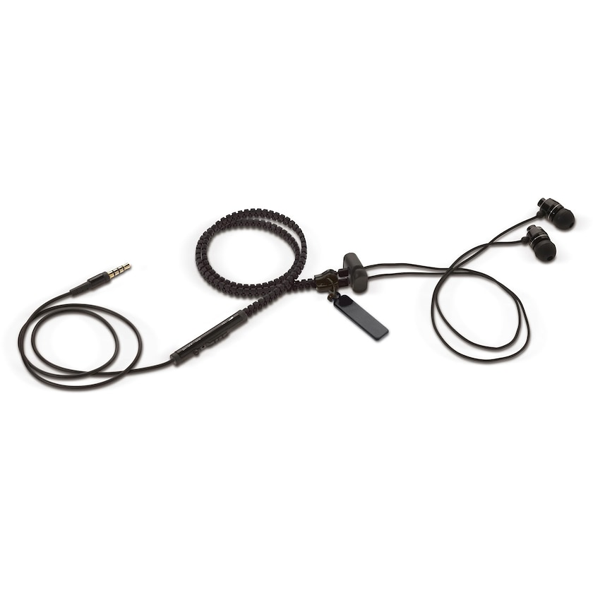 In ear-kuulokkeet vetoketjujohdolla ja mikrofonilla. Vetoketjumekanismi auttaa pitämään johdot siististi nipussa ja vähentää solmujen riskiä. Painatus tehdään vetoketjuosioon. Toimitetaan mikrokuitupussissa.