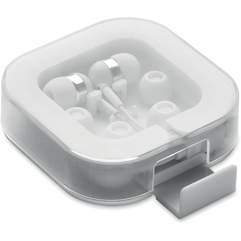 Kuulokkeet säilytysrasiassa, jossa myös puhelinpidike. Kaapeli on 120 cm pitkä. Mukana tulee kolme erikokoista ylimääräistä silikonisuojaa.