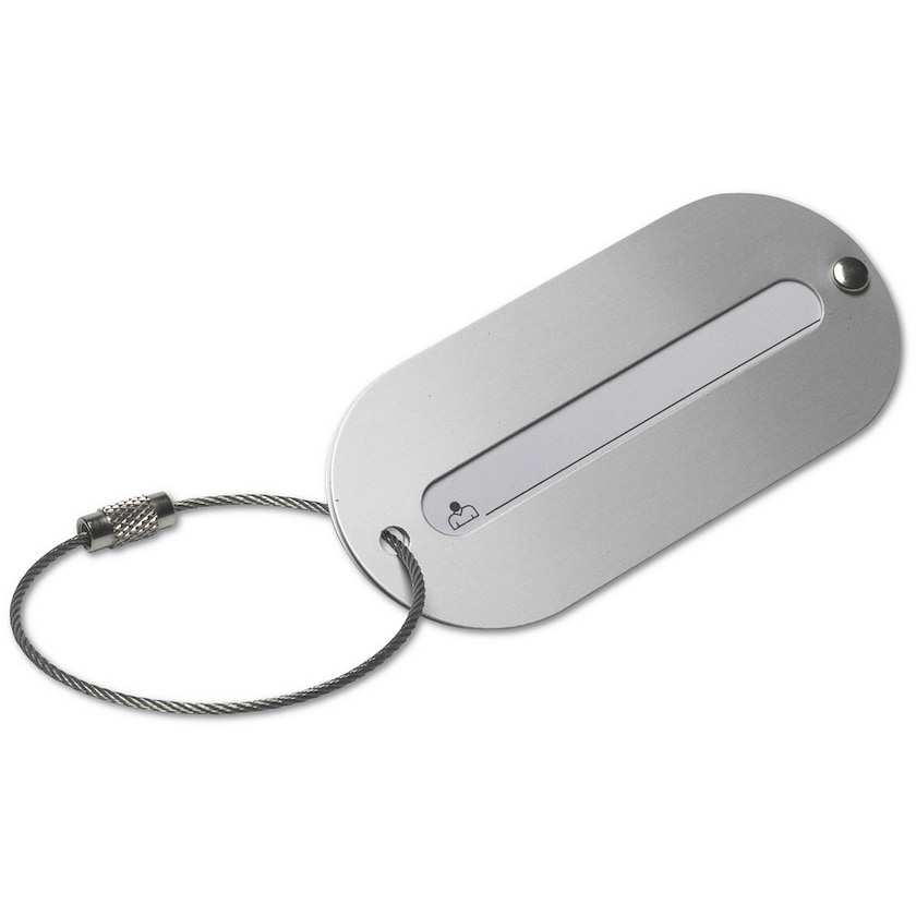 Soikea alumiininen laatta, johon saa kirjoitettua nimitiedot.