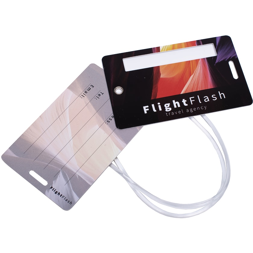 Erikoisvalmistettu matkalaukun nimikyltti kovasta PVC:stä. Jokainen matkalaukun nimikyltti sisältää kaksi korttia. Painatuksen hinta koskee digipainatusta molempien korttien koko etu- ja takapuolelle. Mukana tulee kumilenkki.