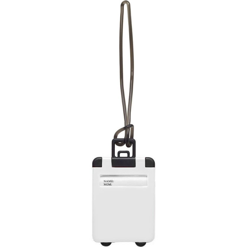 Jännä matkalaukun muotoinen nimi- ja osoitekyltti. Saatavana useissa eri väreissä.