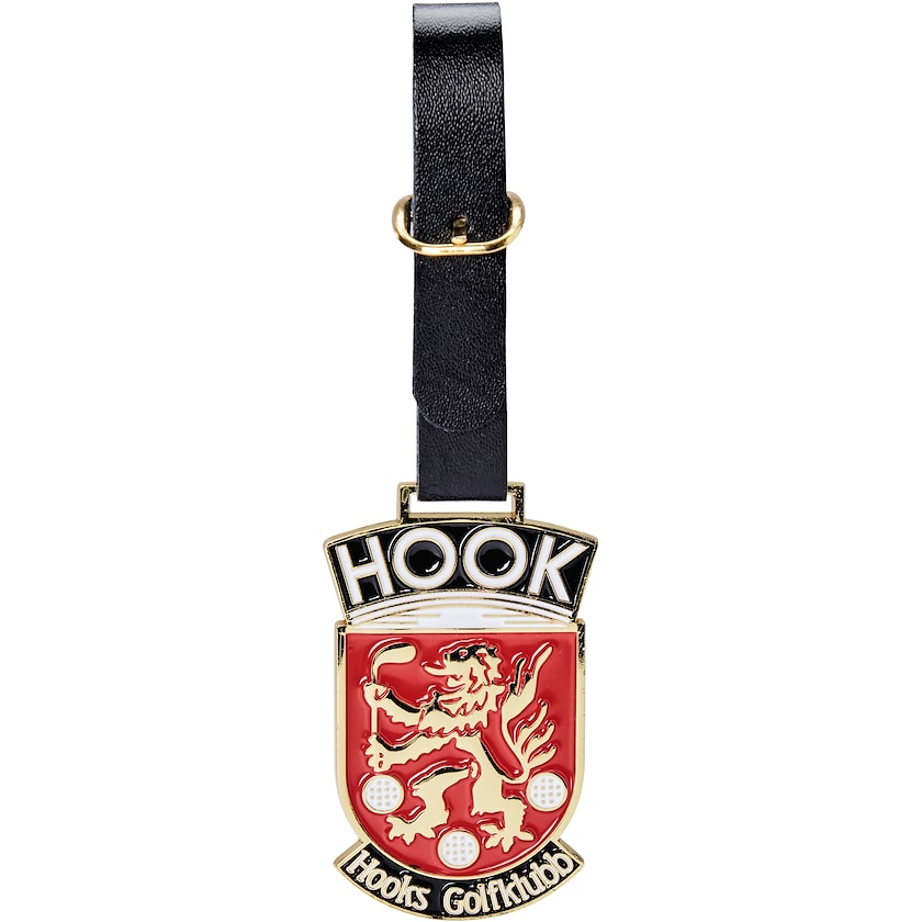 Metallinen klubimerkki golfbägiin. Voit päättää itse merkin koon, värin ja muodon. Sivuilla annettu hinta on laskettu maksimikoolle 50 cm² (2,5 mm paksuus) neljällä värillä. Nahkahihna kuuluu hintaan.