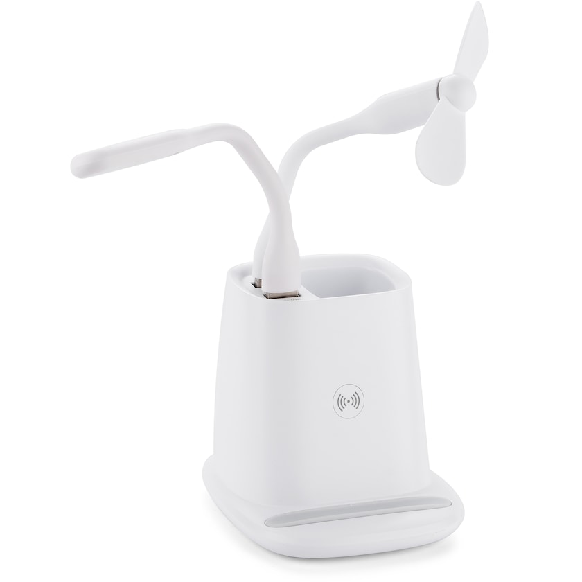 Langaton laturi yhdistettynä kynätelineeseen, lamppuun ja minituulettimeen. Jos laturin toimintoja ei käytetä, laitetta voi käyttää USB-hubina. Toimitetaan valkoisessa pahvirasiassa.