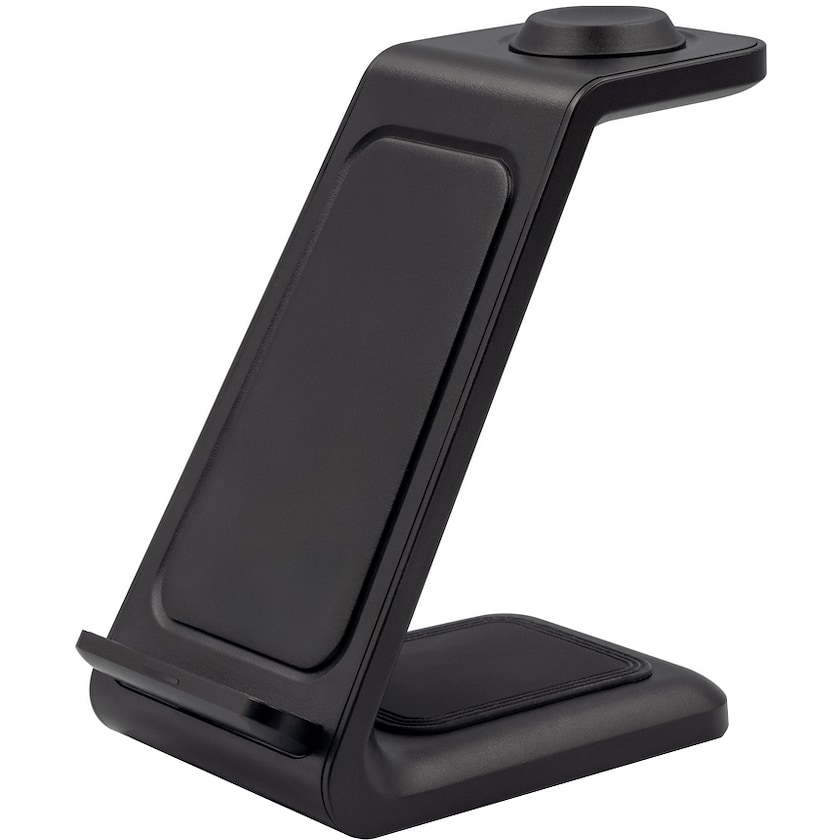 Langaton laturi, joka toimii myös kännykkätukena. Milwaukeella voi ladata kolmea laitetta yhtä aikaa. Mukana USB-C-johto.