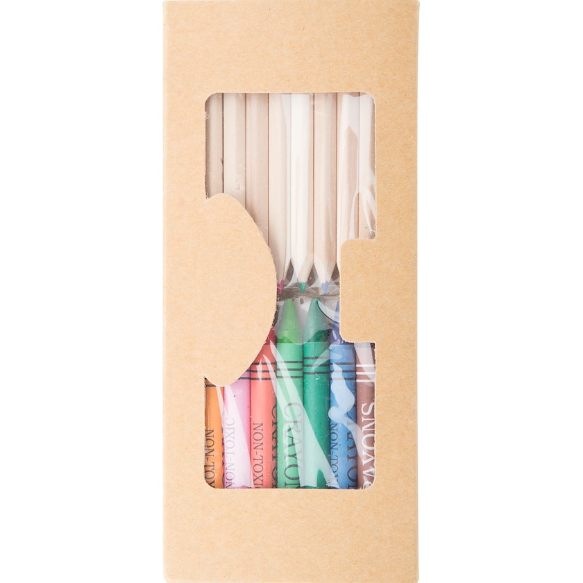 Setti sisältää kymmenen värikynää ja yhdeksän väriliitua luonnonvärisessä paperikotelossa.