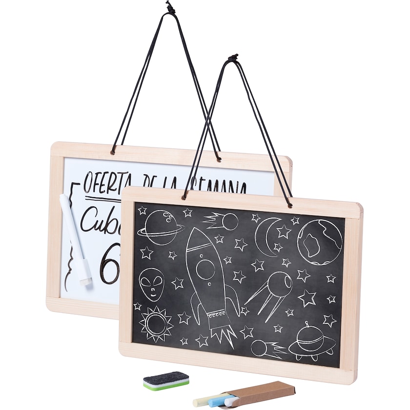 Liitutaulu, jonka kääntöpuolella on valkotaulu. Taulun mukana tulee 3 liitua, tussi sekä pyyhin. Vaihtoehtoina painatus tai laserkaiverrus.